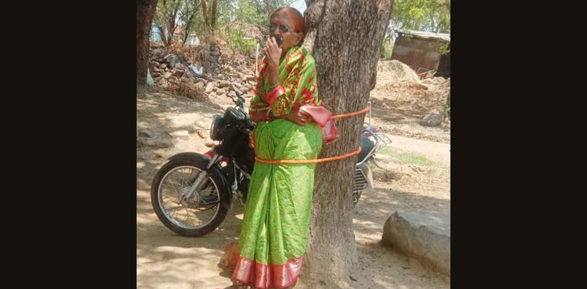 Few villagers tied Vasanta Kumari to a tree with a rope and humiliated her as her husband, Prabhakar, had allegedly cheated them in the name of a finance company.