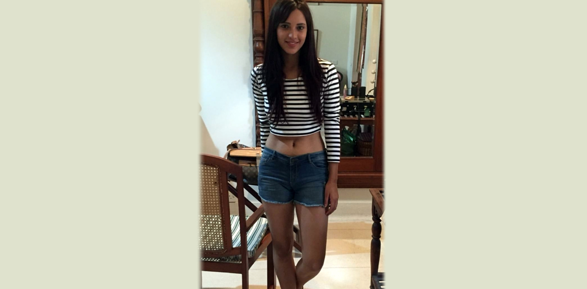 The first picture shows a young Triptii posing at home in a striped crop top paired with denim shorts.