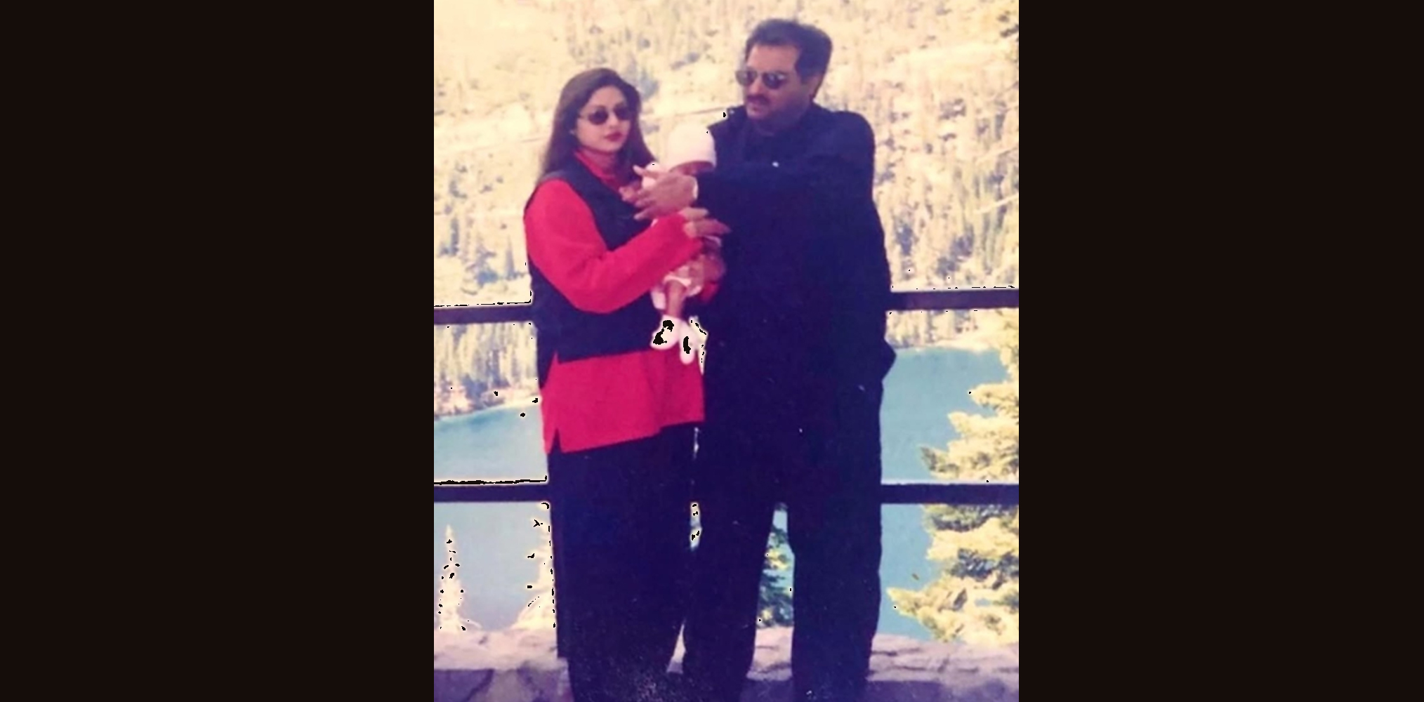 Sridevi, in the picture, is seen dressed in a bright red outfit with a black jacket. She is seen holding little Janhvi in her arms tightly.